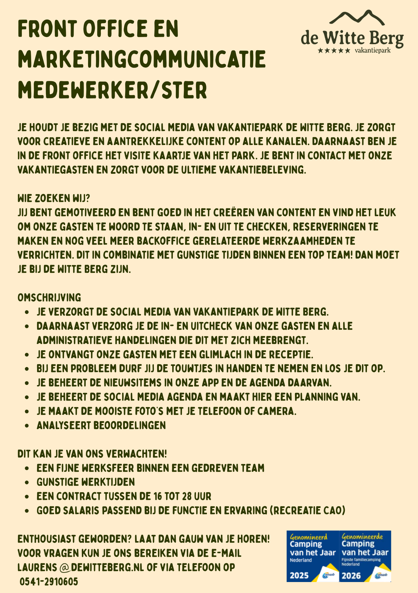 Wil jij werken bij een modern, kwalitatief hoogstaand 5-sterren vakantiepark met vernieuwd restaurant in Ootmarsum en houd je van afwisseling, humor, gezelligheid, weet je van aanpakken en gaat jouw hart sneller kloppen van het tot het onvergetelijk maken van de vakantiebeleving van onze gasten? 🙌 Dan zijn we op zoek naar jou! Wij zijn doorlopend op zoek naar enthousiaste mensen die ons team komen versterken. Kijk hieronder voor de beschikbare vacatures en solliciteer direct. 💪